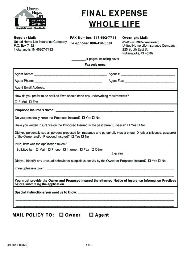 FINAL EXPENSE WHOLE LIFE Regular Mail: United Home Life Insurance Company P.O. Box 7192 Indianapolis, IN 462077192FAX Number: 3176927711Overnight Mail:Telephone: 8004283001(FedEx or UPS Recommended)United
