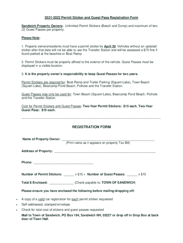 20212022 Permit Stickers and Guest Pass Registration Form Sandwich Property Owners: Unlimited Permit Stickers (Beach and Dump) and maximum of two (2) Guest Passes per property. Please Note: 1. Property