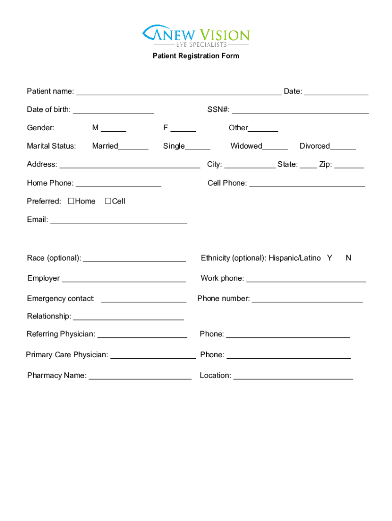Patient Registration Formation name: ___ Date: ___ Date of birth: ___SSN#: ___Gender’M ___F ___Other___Marital Status:Married___Single___Widowed___Divorced___Address: ___ City: ___ State: ___ Zip: