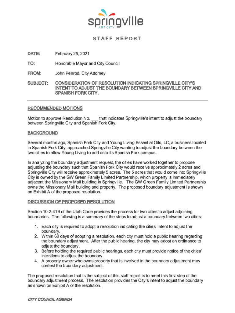 STAFF REPORT DATE:February 25, 2021TO:Honorable Mayor and City Councilor:John Pernod, City AttorneySUBJECT:CONSIDERATION OF RESOLUTION INDICATING SPRINGVILLE CITY INTENT TO ADJUST THE BOUNDARY BETWEEN