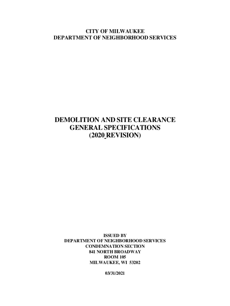 CITY OF MILWAUKEE DEPARTMENT OF NEIGHBORHOOD SERVICESDEMOLITION AND SITE CLEARANCE GENERAL SPECIFICATIONS (2020 REVISION)ISSUED BY DEPARTMENT OF NEIGHBORHOOD SERVICES CONDEMNATION SECTION 841 NORTH
