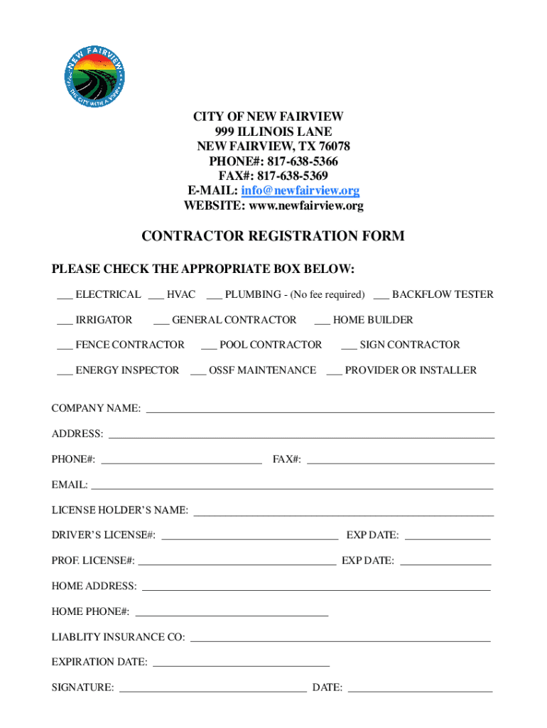 TX Contractor Registration Form - City of New Fairview 2020-2026 free printable template
