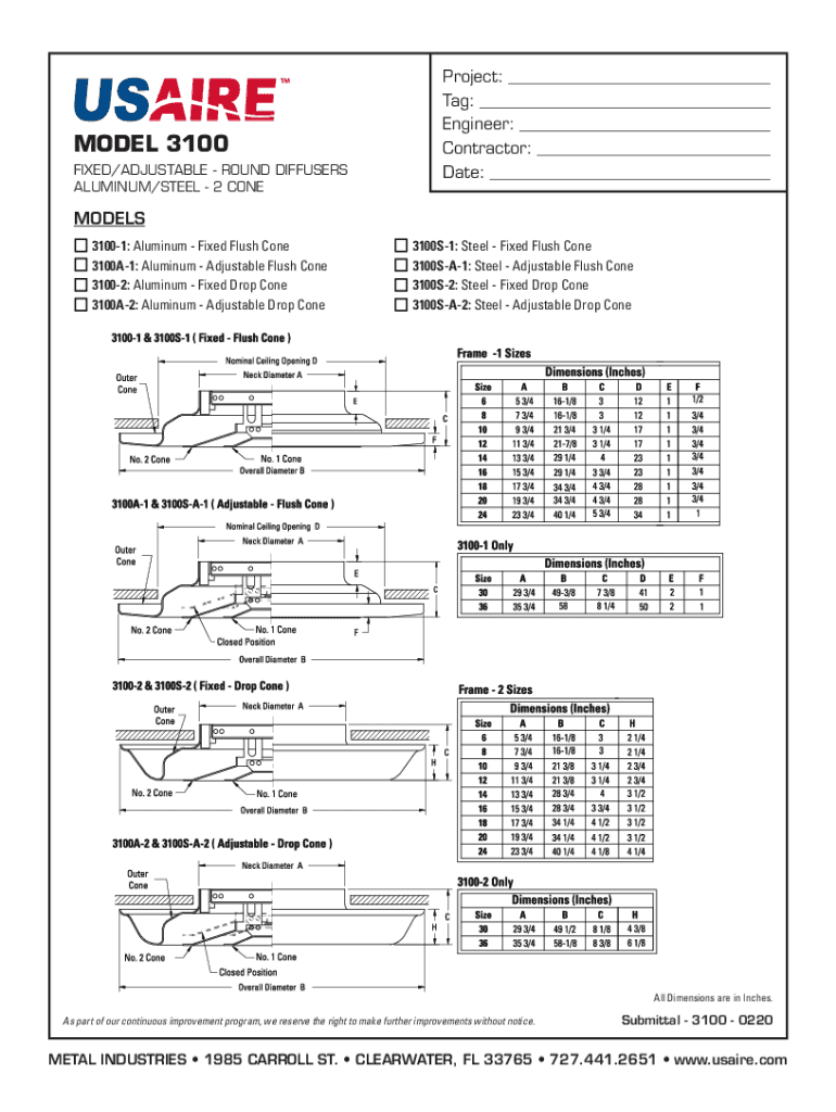 MODEL 3100 FIXED/ADJUSTABLE ROUND DIFFUSERS ALUMINUM/STEEL 2 CONEProject: ___ Tag: ___ Engineer: ___ Contractor: ___ Date: ___MODELS 31001: Aluminum Fixed Flush Cone 3100A1: Aluminum Adjustable Flush