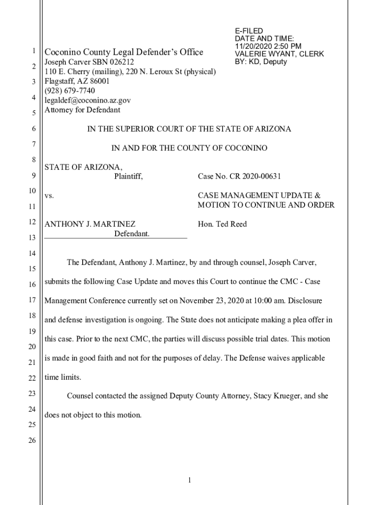 1 2 3 4 5Coconino County Legal Defenders Office Joseph Carver SON 026212 110 E. Cherry (mailing), 220 N. Le roux St (physical) Flagstaff, AZ 86001 (928) 6797740 legaldef@coconino.az.gov Attorney for