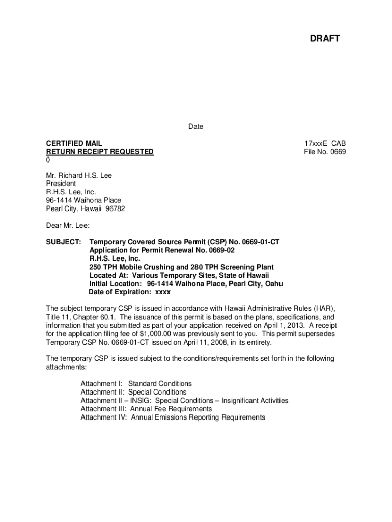 Draftee CERTIFIED MAIL RETURN RECEIPT REQUESTED17xxxE CAB File No. 0669()Mr. Richard H.S. Lee President R.H.S. Lee, Inc. 961414 Winona Place Pearl City, Hawaii 96782 Dear Mr. Lee: SUBJECT:Temporary