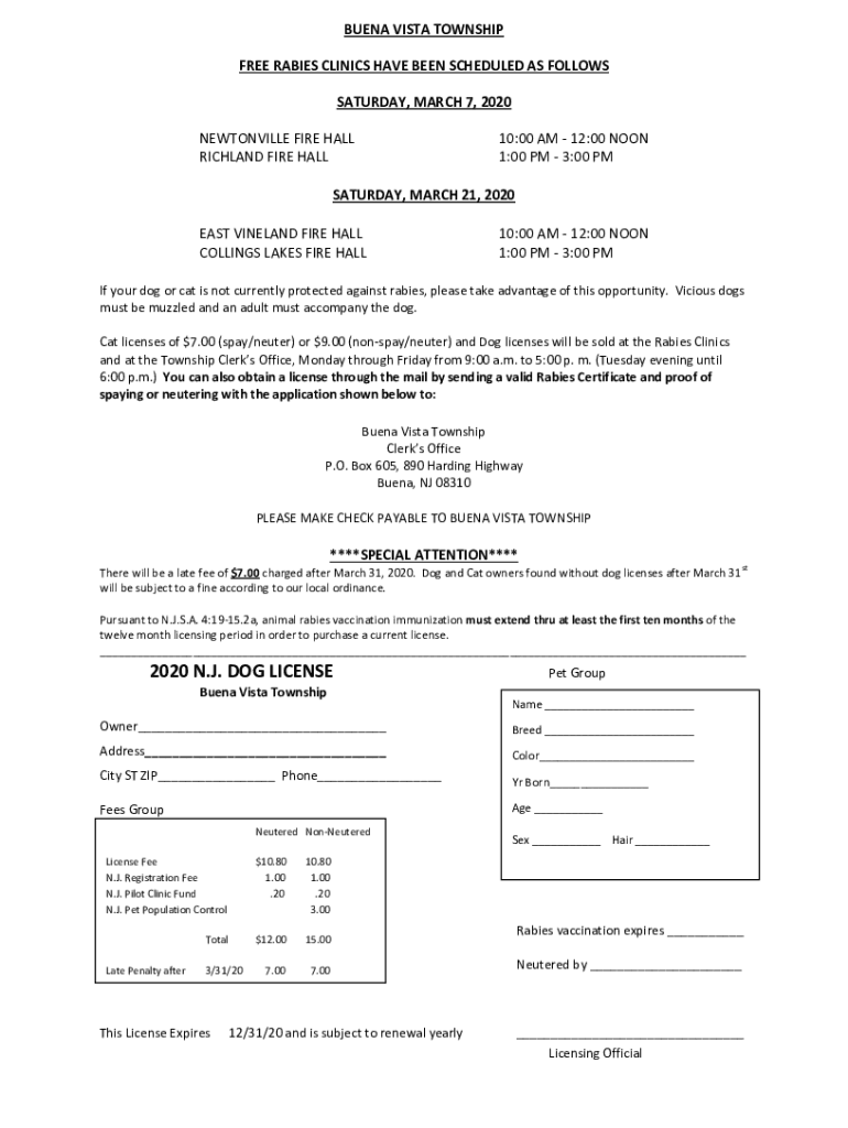 BUENA VISTA TOWNSHIP FREE RABIES CLINICS HAVE BEEN SCHEDULED AS FOLLOWS SATURDAY, MARCH 7, 2020, BENTONVILLE FIRE HALL RICHLAND FIRE HALL10:00 AM 12:00 NOON 1:00 PM 3:00 SATURDAY, MARCH 21, 2020,