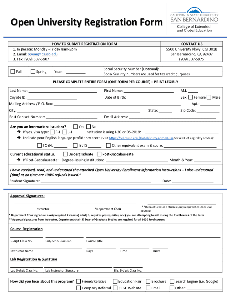 Open University Registration Form HOW TO SUBMIT REGISTRATION FORM 1. In person: Monday Friday 8am5pm 2. Email: openu@csusb.edu 3. Fax: (909) 5375907 FallSpringCONTACT US 5500 University Pkwy, CGI