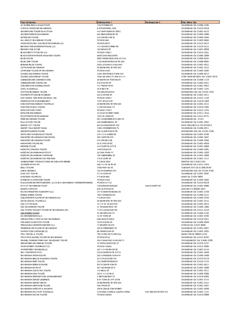 Tour Company 40 ACRES AND A MULE TOUR A WALK THROUGH SAVANNAH ADVENTURE TOURS IN MOTION ADVENTURES IN SAVANNAH AFTERLIFE TOURS ALL ABOUT SAVANNAH TOURS ARCHITECTURAL TOURS OF SAVANNAH LLC BEYOND THE