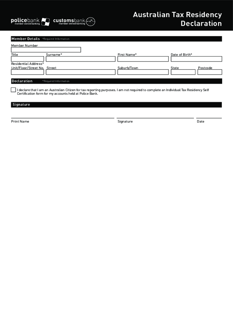 Australian Tax Residency Declaration Member Details×Required InformationMember Number TitleSurname×Residential Address* Unit/Floor/Street No. StreetDeclarationFirst Name×Date of Birth×Suburb/TownStatePostcode×Required