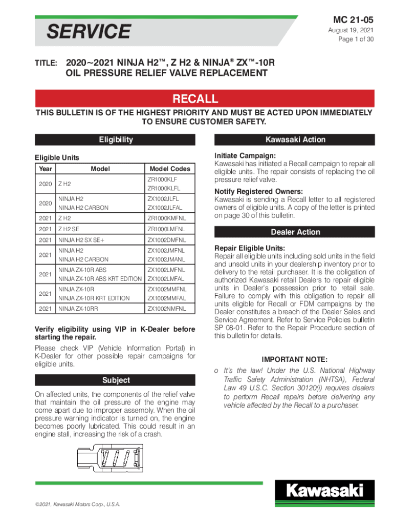 MC 2105SERVICE TITLE:August 19, 2021-Page 1 of 3020202021 NINJA H₂, Z H₂ & NINJA ZX10R OIL PRESSURE RELIEF VALVE REPLACEMENTRECALL THIS BULLETIN IS OF THE HIGHEST PRIORITY AND MUST BE ACTED UPON