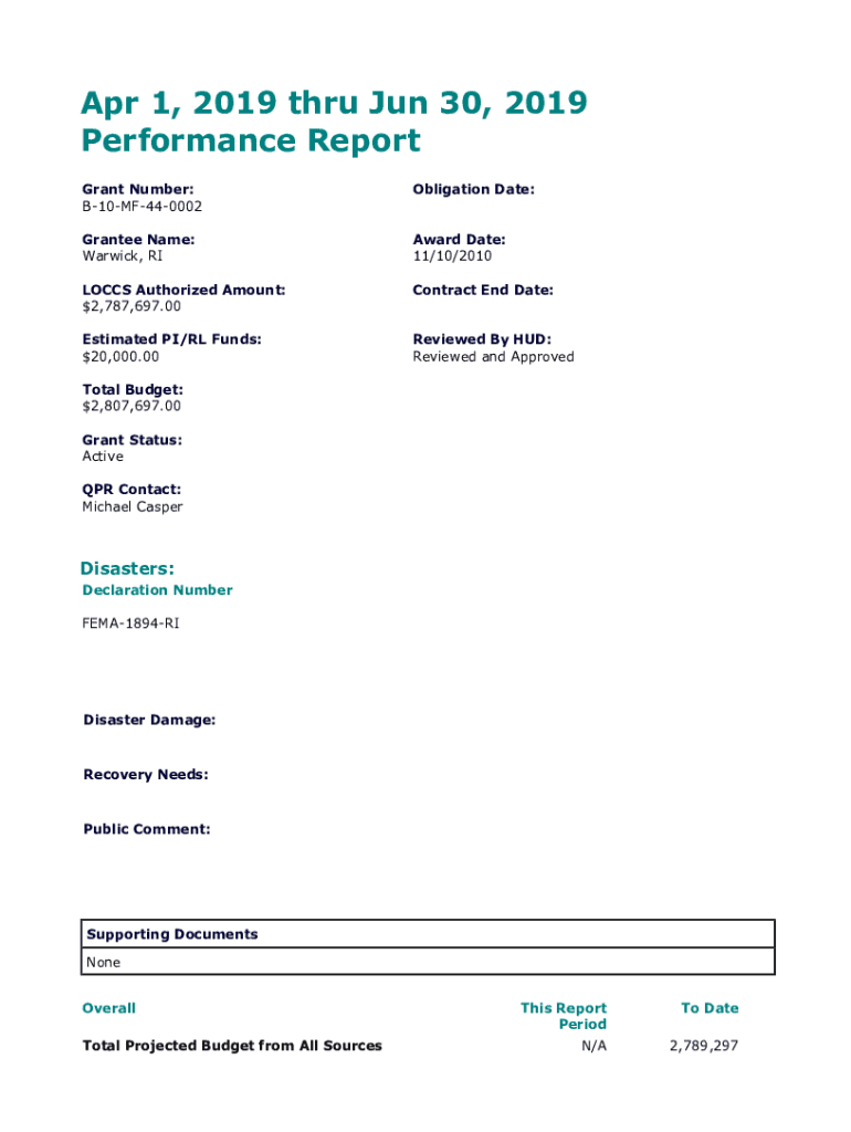 Apr 1, 2019 through Jun 30, 2019 Performance Report Grant Number: B10MF440002Obligation Date:Grantee Name: Warwick, RIAward Date: 11/10/2010LOCCS Authorized Amount: $2,787,697.00Contract End Date:Estimated