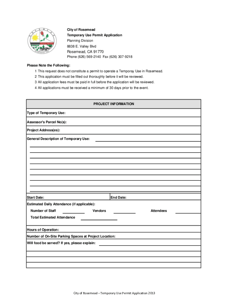 City of Rose mead Temporary Use Permit Application Planning Division 8838 E. Valley BlvdRosemead, CA 91770 Phone (626) 5692140 Fax (626) 3079218 Please Note the Following: 1 This request does not