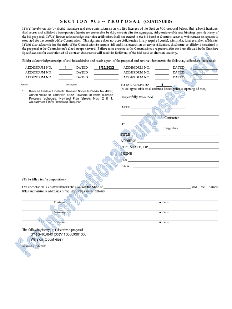 S E C T I O N 9 0 5 P R O P O S A L (CONTINUED) I (We) hereby certify by digital signature and electronic submission via Bid Express of the Section 905 proposal below, that all certifications, disclosures