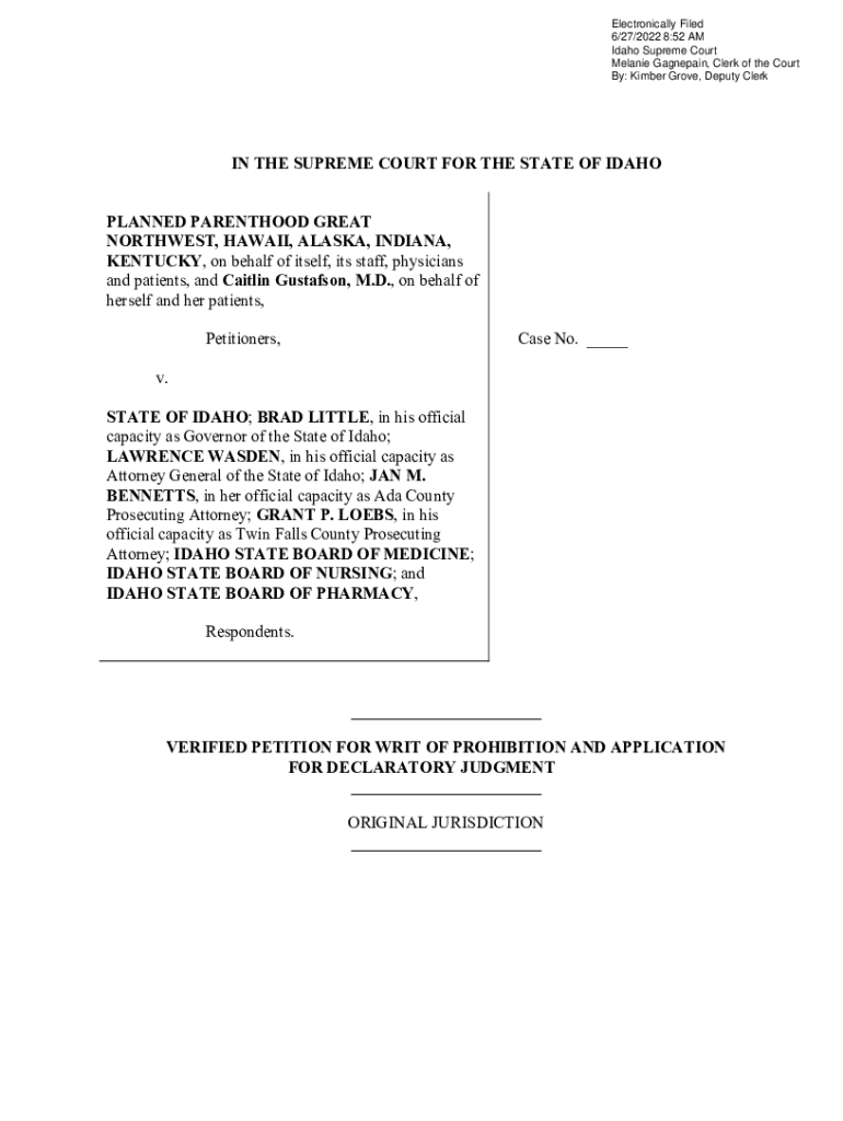 Electronically Filed 6/27/2022 8:52 AM Idaho Supreme Court Melanie Wagnerian, Clerk of the Court By: Timber Grove, Deputy Clerking THE SUPREME COURT FOR THE STATE OF IDAHO PLANNED PARENTHOOD GREAT