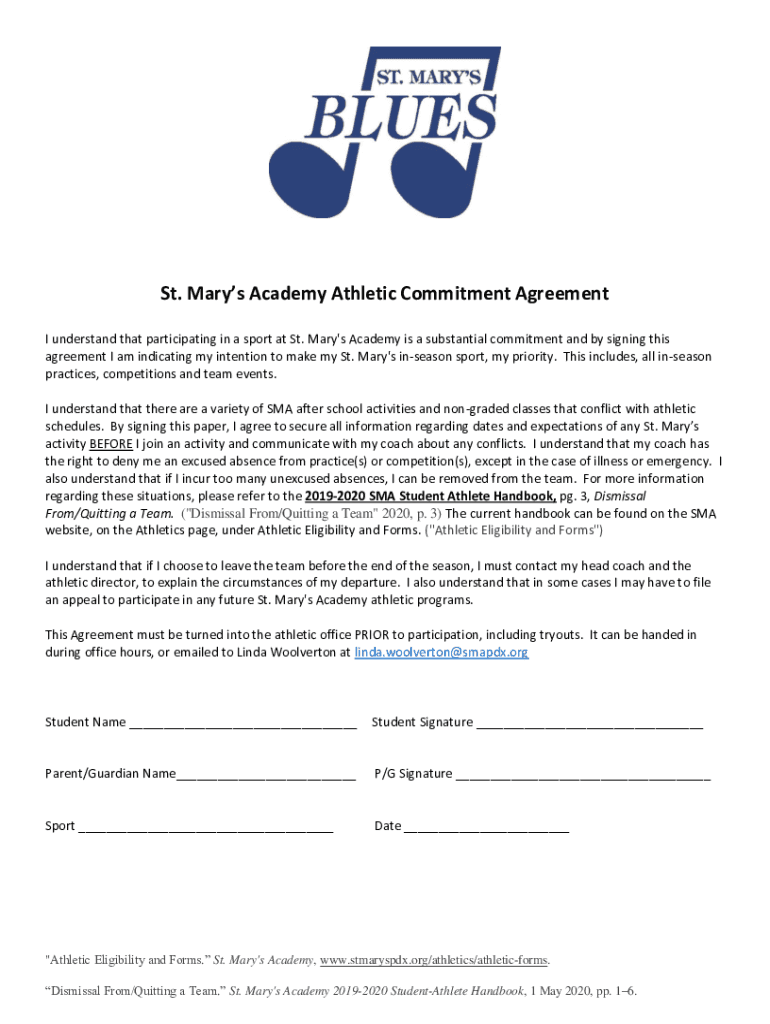 St. Mary's Academy Athletic Commitment Agreement I understand that participating in a sport at St. Mary\'s Academy is a substantial commitment and by signing this agreement I am indicating my intention