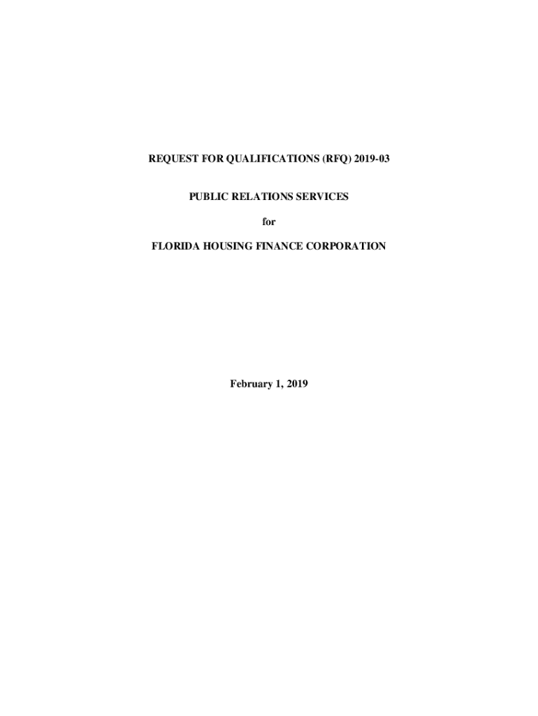 REQUEST FOR QUALIFICATIONS (RFQ) 201903PUBLIC RELATIONS SERVICES for FLORIDA HOUSING FINANCE CORPORATION February 1, 2019SECTION ONE INTRODUCTION Florida Housing Finance Corporation (Florida Housing)