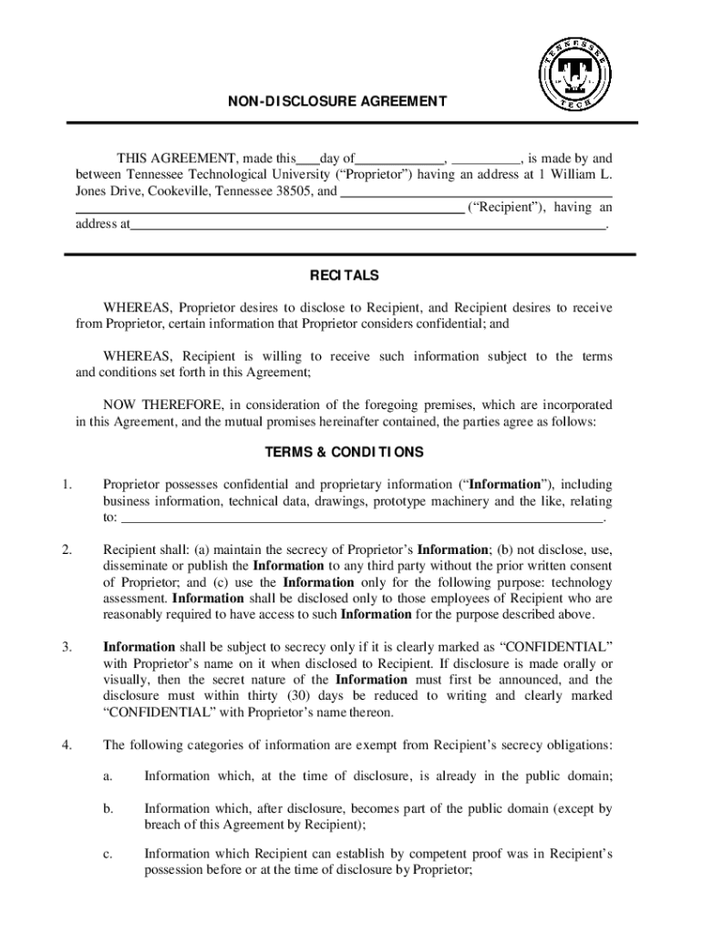 NONDISCLOSURE AGREEMENTS AGREEMENT, made this day of, ___, is made by and between Tennessee Technological University (Proprietor) having an address at 1 William L. Jones Drive, Cookeville, Tennessee