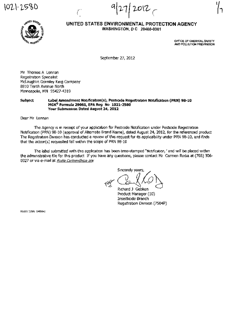 LOI_. R UNITED STATES ENVIRONMENTAL PROTECTION AGENCY WASHINGTON, D C 204600001 OFFICE OF CHEMICAL SAFETY AND POLLUTION PREVENTION September 27, 2012Mr Thomas A Lennon Registration Specialist McLaughlin