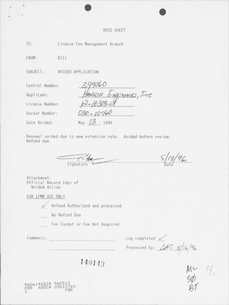 ...]. . O._.o V0ID SHEET TO:License Fee Management BranchFROM:RIIISUBJECT:VOIDED APPLICATION*|$77 Control Number:N ha#WIP/S [TD\' /[Applicant:j;License Number:docket Number:O30 /O\'/Date Voided:May
