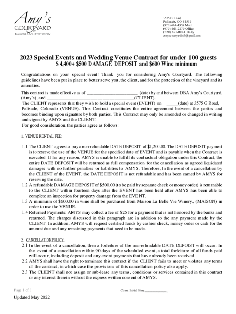 3575 G Road, Palisade, CO 81516 (970) 4644959 Main (970) 4642270 Office (720) 6210044 Holly Amyscourtyardinfo@gmail.com2023 Special Events and Wedding Venue Contract for under 100 guests $4,400+ $500