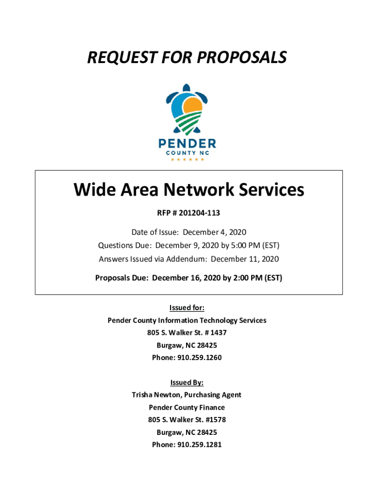 REQUEST FOR PROPOSALSWide Area Network Services RFP # 201204113 Date of Issue: December 4, 2020, Questions Due: December 9, 2020, by 5:00 PM (EST) Answers Issued via Addendum: December 11, 2020, Proposals