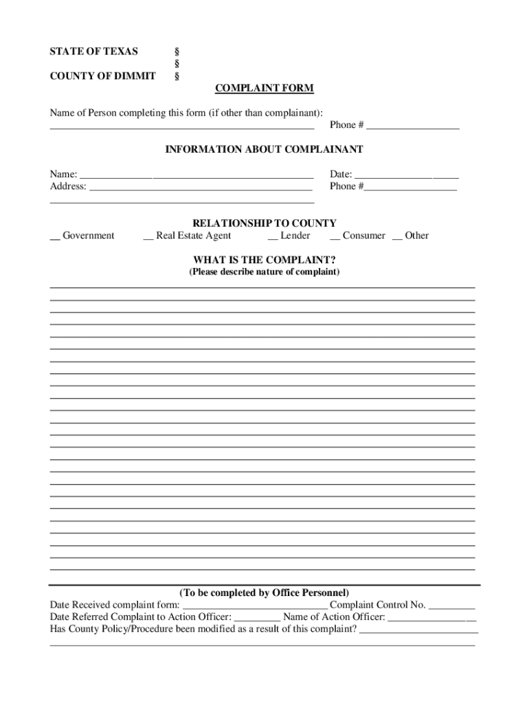 STATE OF TEXAS COUNTY OF DIMWIT COMPLAINT Forename of Person completing this form (if other than complainant): ___ Phone # ___ INFORMATION ABOUT COMPLAINANT Name: ___ Address: ___ _____ Governmental:
