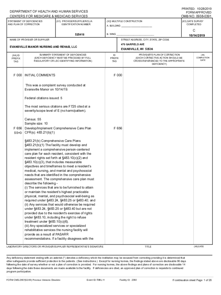 PRINTED: 10/28/2019 FORM APPROVEDDEPARTMENT OF HEALTH AND HUMAN SERVICES CENTERS FOR MEDICARE & MEDICAID SERVICES STATEMENT OF DEFICIENCIES AND PLAN OF CORRECTION(X1) PROVIDER/SUPPLIER/CIA IDENTIFICATION
