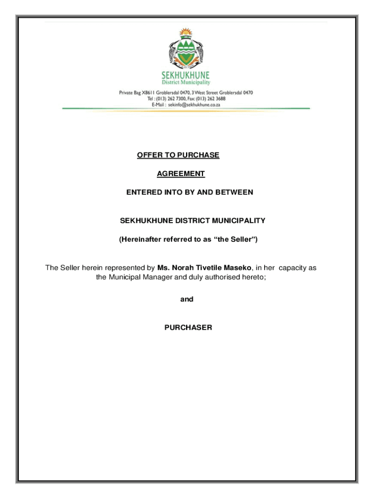 OFFER TO PURCHASE AGREEMENT ENTERED INTO BY AND BETWEENSEKHUKHUNE DISTRICT MUNICIPALITY (Hereinafter referred to as the Seller)The Seller herein represented by Ms. Norah Title Mask, in her capacity