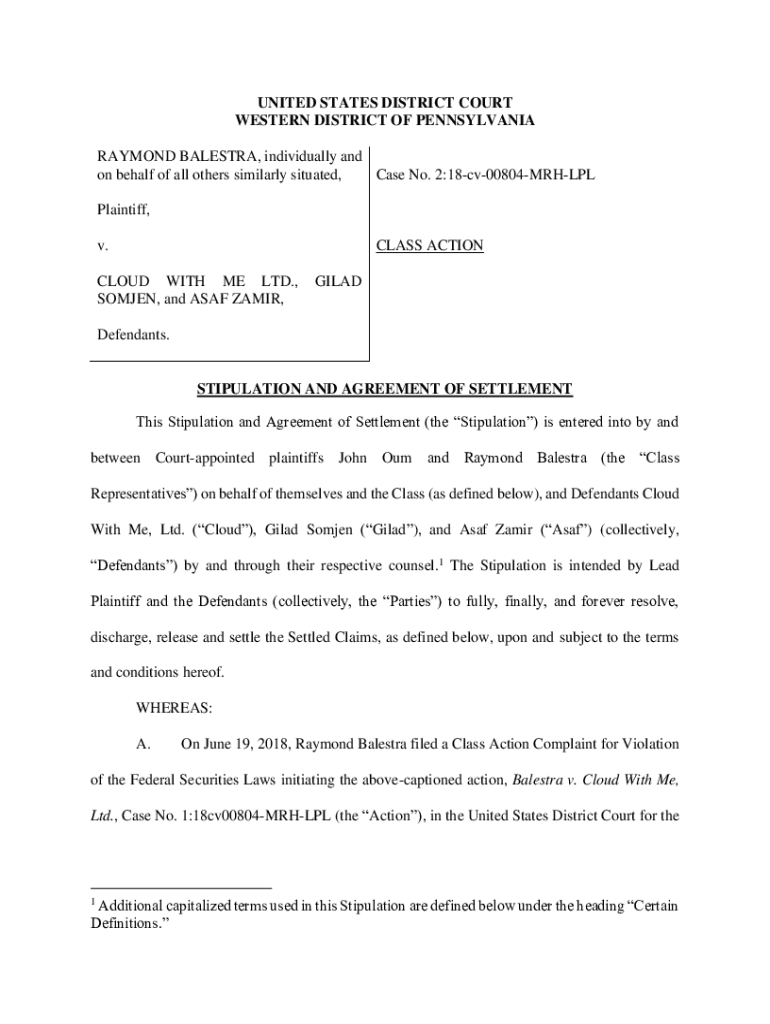 UNITED STATES DISTRICT COURT WESTERN DISTRICT OF PENNSYLVANIA RAYMOND BATISTA, individually and on behalf of all others similarly situated, Case No. 2:18cv00804MRHLPL Plaintiff, v.CLASS ACTIONCLOUD