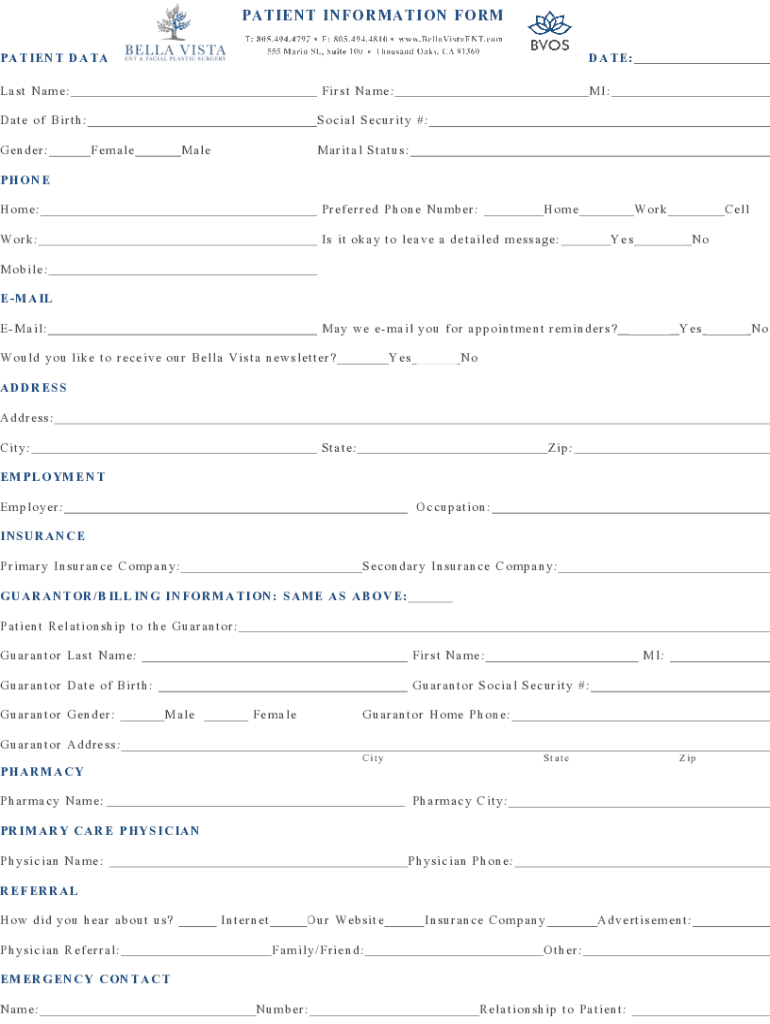 PATIENT INFORMATION FORM D A T E :PATIENT DATA Last Name:First Name:Date of Birth: Gender:MI:Social Security #: FemaleMaleMarital Status:PHONE Home:Preferred Phone Number:Homework:Is it okay to leave