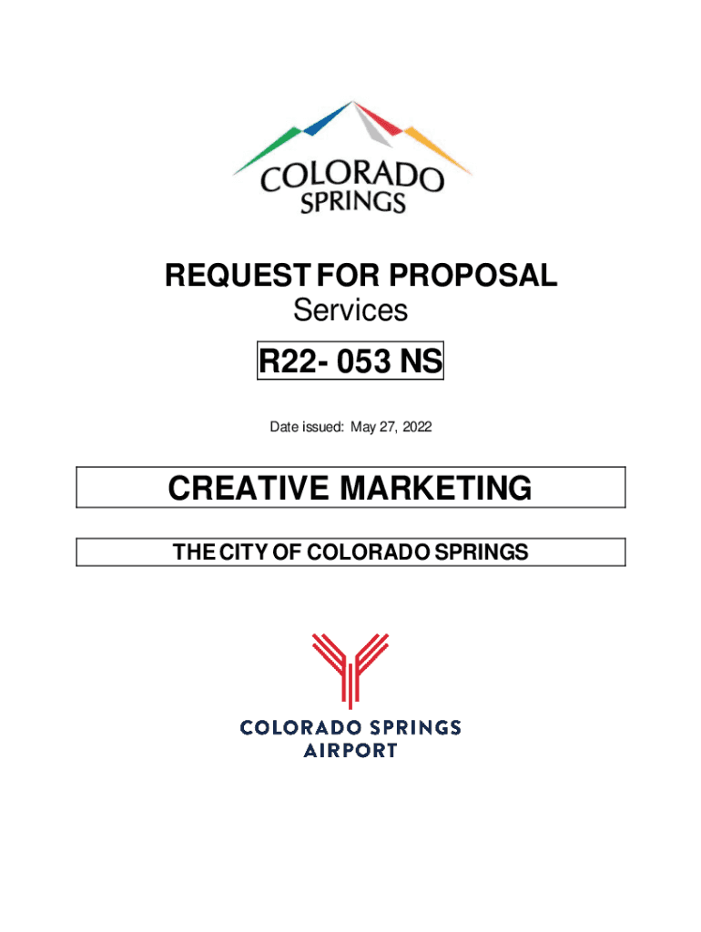 REQUEST FOR PROPOSAL ServicesR22 053 NS Date issued: May 27, 2022CREATIVE MARKETING THE CITY OF COLORADO Springsteen City of Colorado Springs requests time proposals, as detailed in this Request for