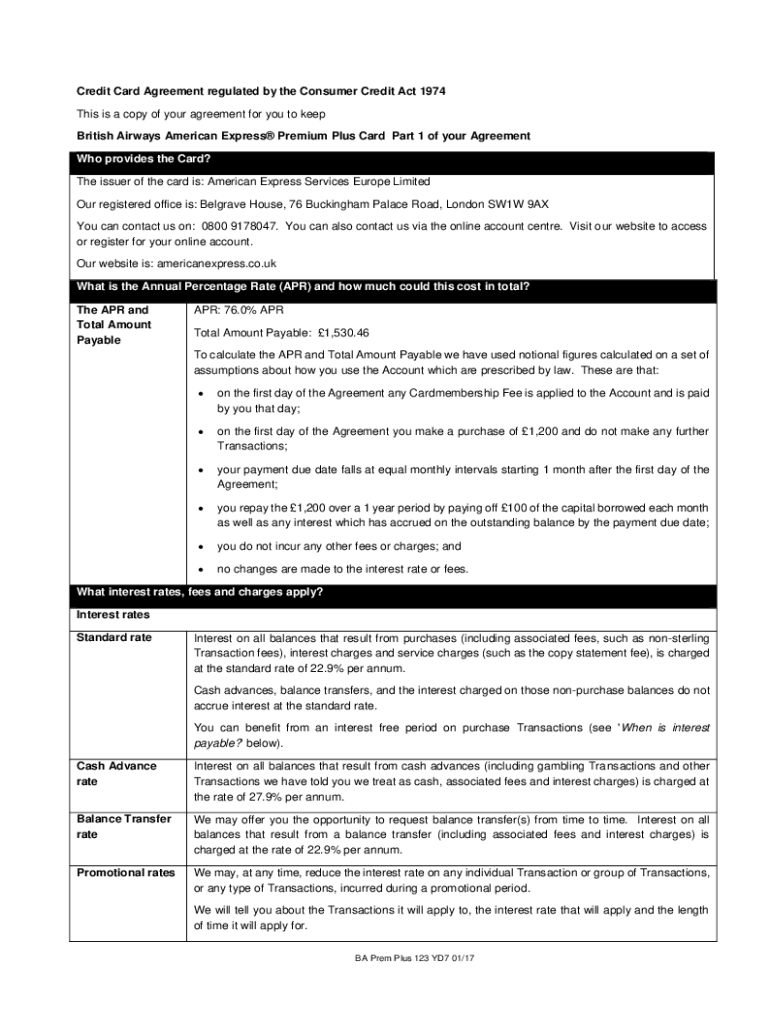 Credit Card Agreement regulated by the Consumer Credit Act 1974 This is a copy of your agreement for you to keep British Airways American Express Premium Plus Card Part 1 of your Agreement Who provides