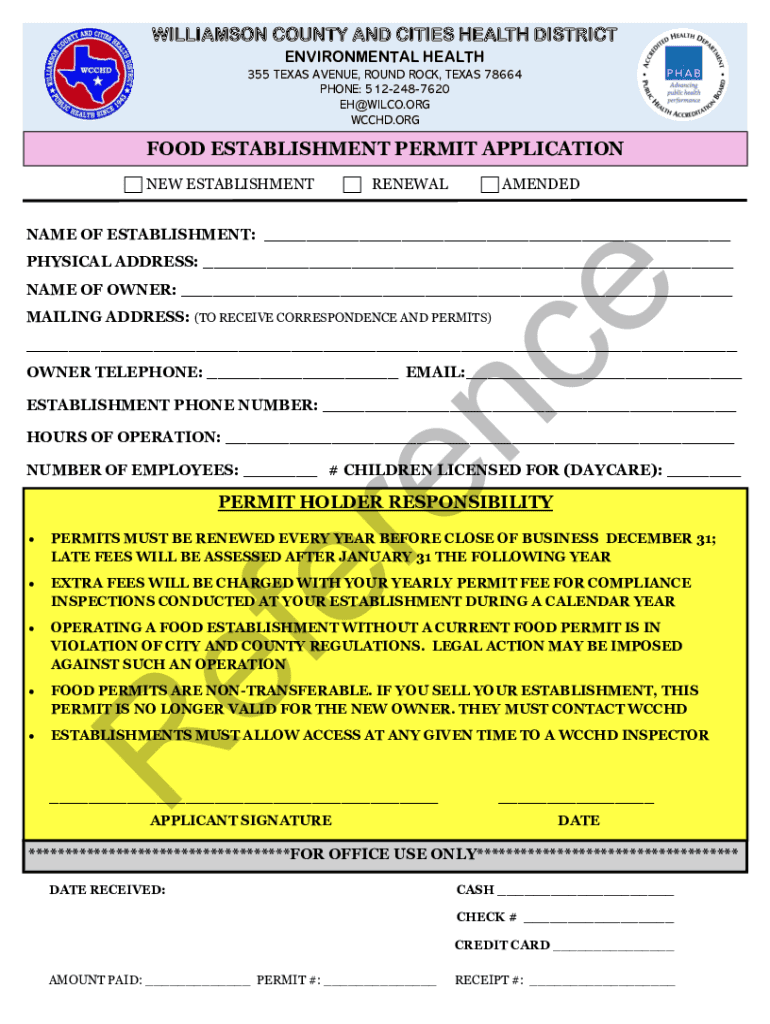 WILLIAMSON COUNTY AND CITIES HEALTH DISTRICT ENVIRONMENTAL HEALTH 355 TEXAS AVENUE, ROUND ROCK, TEXAS 78664 PHONE: 5122487620 EH@WILCO.ORG WC CHD.OSGOOD ESTABLISHMENT PERMIT APPLICATION NEW ESTABLISHMENTRENEWALAMENDEDNAME