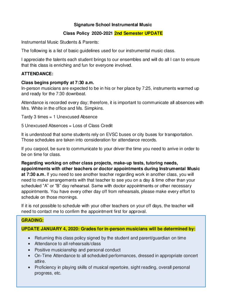 Signature School Instrumental Music Class Policy 20202021 2nd Semester UPDATE Instrumental Music Students & Parents: The following is a list of basic guidelines used for our instrumental music class.