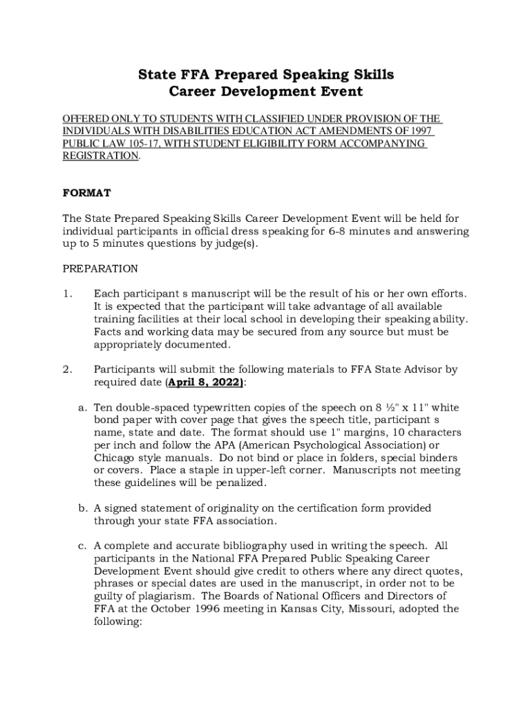 State FFA Prepared Speaking Skills Career Development Event OFFERED ONLY TO STUDENTS WITH CLASSIFIED UNDER PROVISION OF THE INDIVIDUALS WITH DISABILITIES EDUCATION ACT AMENDMENTS OF 1997 PUBLIC LAW