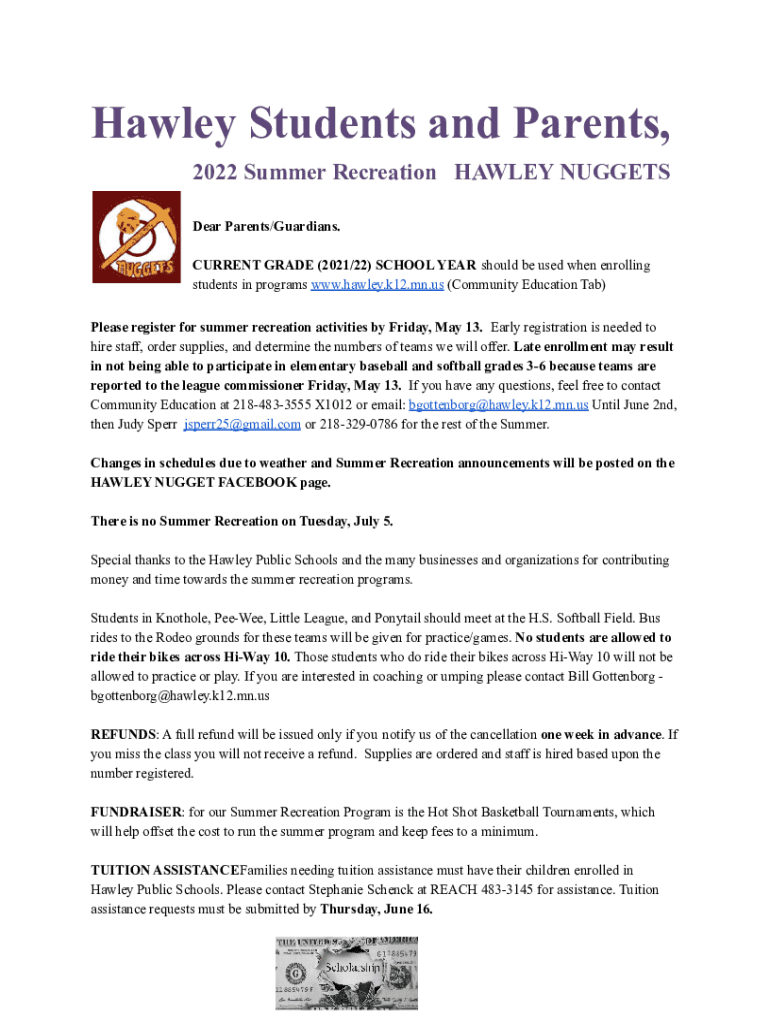 Hawley Students and Parents, 2022 Summer Recreation HAWLEY NUGGETS Dear Parents/Guardians. CURRENT GRADE (2021/22) SCHOOL YEAR should be used when enrolling students in programs www.hawley.k12.mn.us