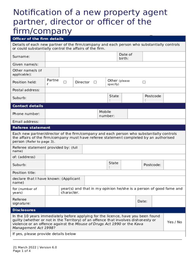 What is Notification of a new property agent partner, director or officer of the firm/company - nt gov Form?