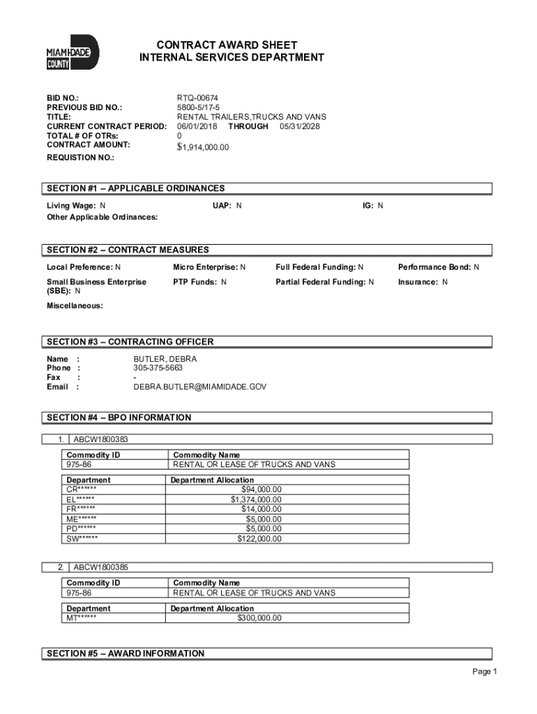 CONTRACT AWARD SHEET INTERNAL SERVICES DEPARTMENT BID NO.: PREVIOUS BID NO.: TITLE: CURRENT CONTRACT PERIOD: TOTAL # OF Otis: CONTRACT AMOUNT:RTQ00674 58005/175 RENTAL TRAILERS, TRUCKS AND VANS 06/01/2018