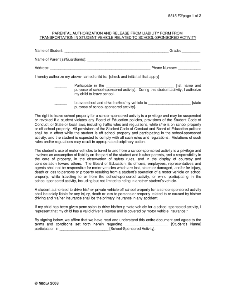 5515 F2/page 1 of 2PARENTAL AUTHORIZATION AND RELEASE FROM LIABILITY FORM FROM TRANSPORTATION IN STUDENT VEHICLE RELATED TO SCHOOLSPONSORED ACTIVITYName of Student: ___ Grade: ___ Name of Parent(s)/Guardian(s):