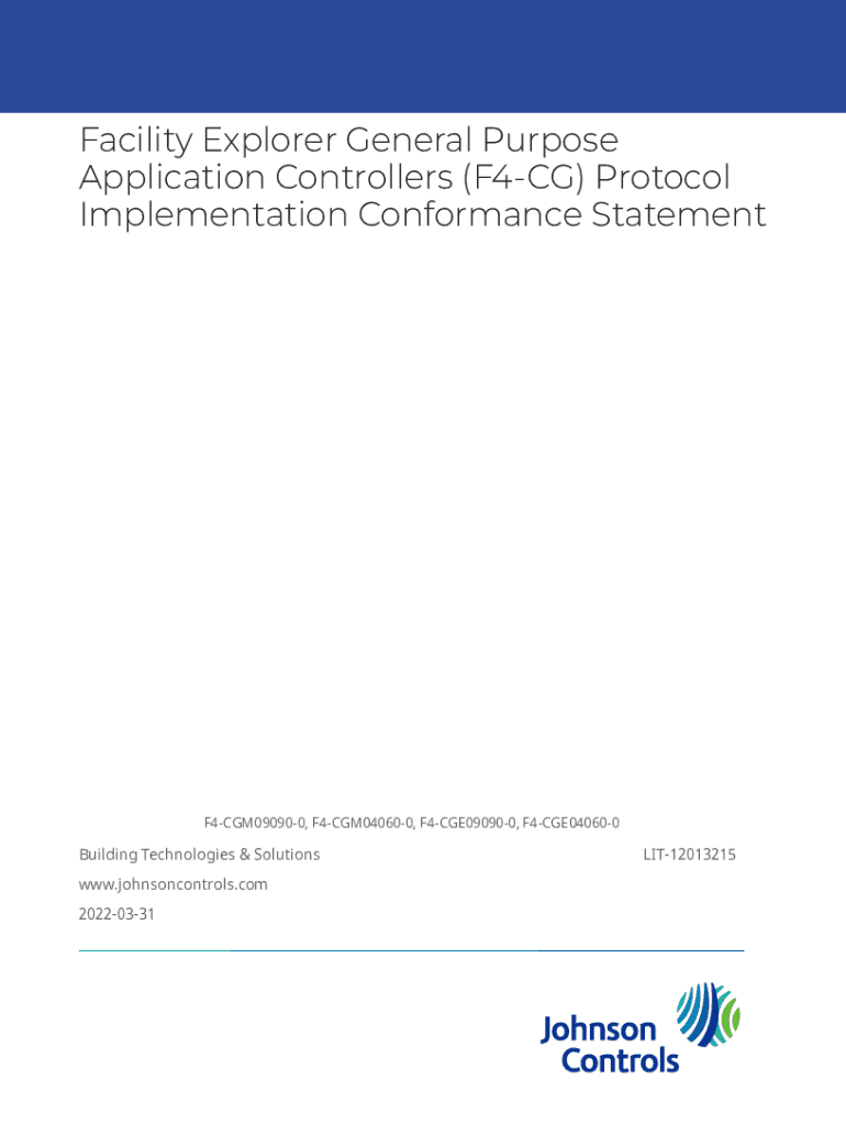 Facility Explorer General Purpose Application Controllers (F4CG) Protocol Implementation Conformance StatementF4CGM090900, F4CGM040600, F4CGE090900, F4CGE040600Building Technologies & Solutions www.johnsoncontrols.com