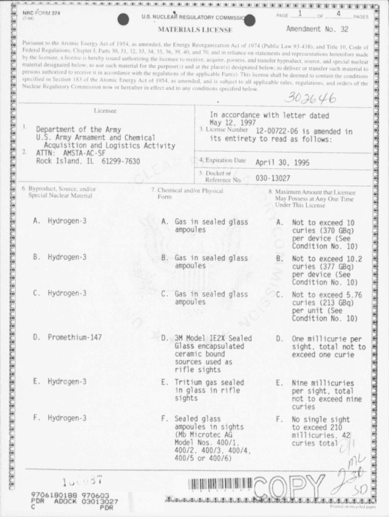 _ _. _ _ _ _. . . . .a, o. A v, I'm an o a w ENE w rm name martyr rapt _*NRC FORM 374U. S. Nuclear REGULATORY Commission a jPAGEOFPAGESAmendment No. 32MATERIALS LICENSE5 Pursuant to the Atomic Energy