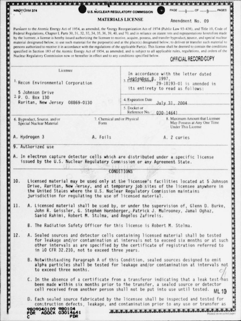(IN ES g3,Amendment No. 09E| by the licensee, a license is hereby issued authorizing the licensee to receive, acquire, possess, and transfer byproduct, source, and special nuclear j material designated