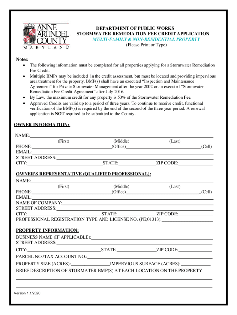 DEPARTMENT OF PUBLIC WORKS STORMWATER REMEDIATION FEE CREDIT APPLICATION MULTIFAMILY & NONRESIDENTIAL PROPERTY (Please Print or Type) Notes: The following information must be completed for all properties