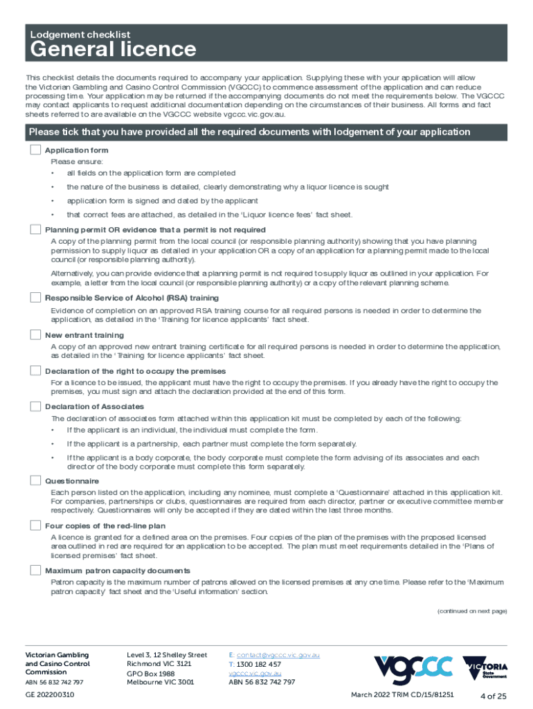 Liquor license application general license This kit contains all the forms and related materials required to apply for a general license in Victoria. Contents: 1. Useful information and definitions