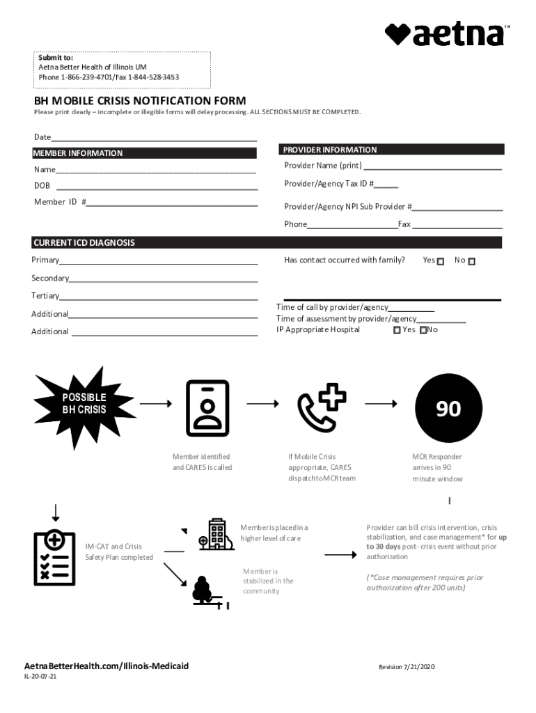Submit to: Aetna Better Health of Illinois UM Phone 18662394701/Fax 18445283453BH MOBILE CRISIS NOTIFICATION Formulas print clearly incomplete or illegible forms will delay processing. ALL SECTIONS