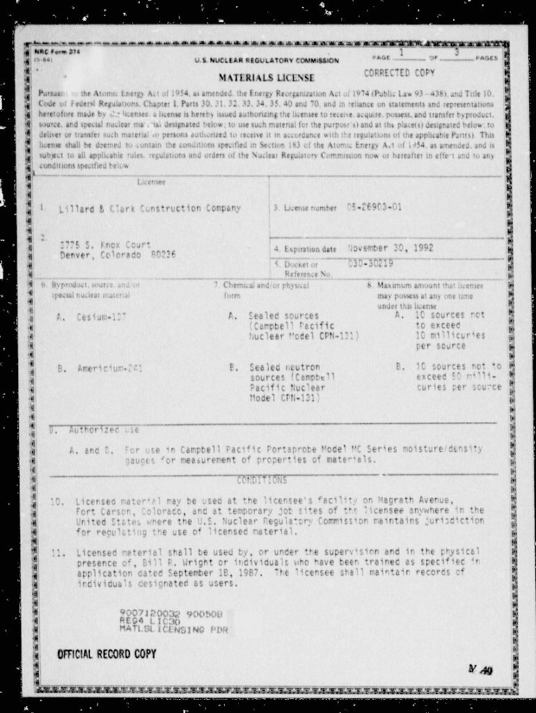 Y.w_, _____., .g............NRC Form 374, g n.a 3 PAGE. S. NUCLEAR RESULT;RY COMMIS$1;NOF3gPACESCORRECTED COPYMATERIALS LICENSE×1Pursuam to the Aconite Energy Act of 1954, as amended, the Energy