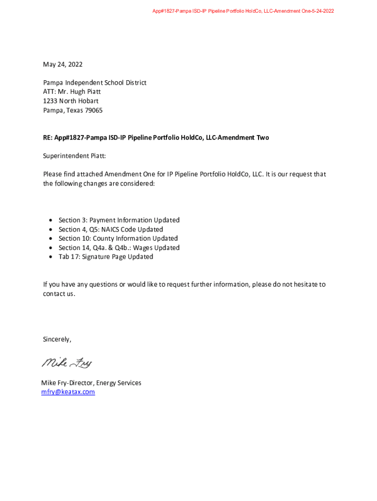 App#1827Pampa ISIP Pipeline Portfolio Hold Co, Amendment One5242022May 24, 2022 Pampa Independent School District ATT: Mr. Hugh Pitt 1233 North Hobart Pampa, Texas 79065 RE: App#1827Pampa ISIP Pipeline