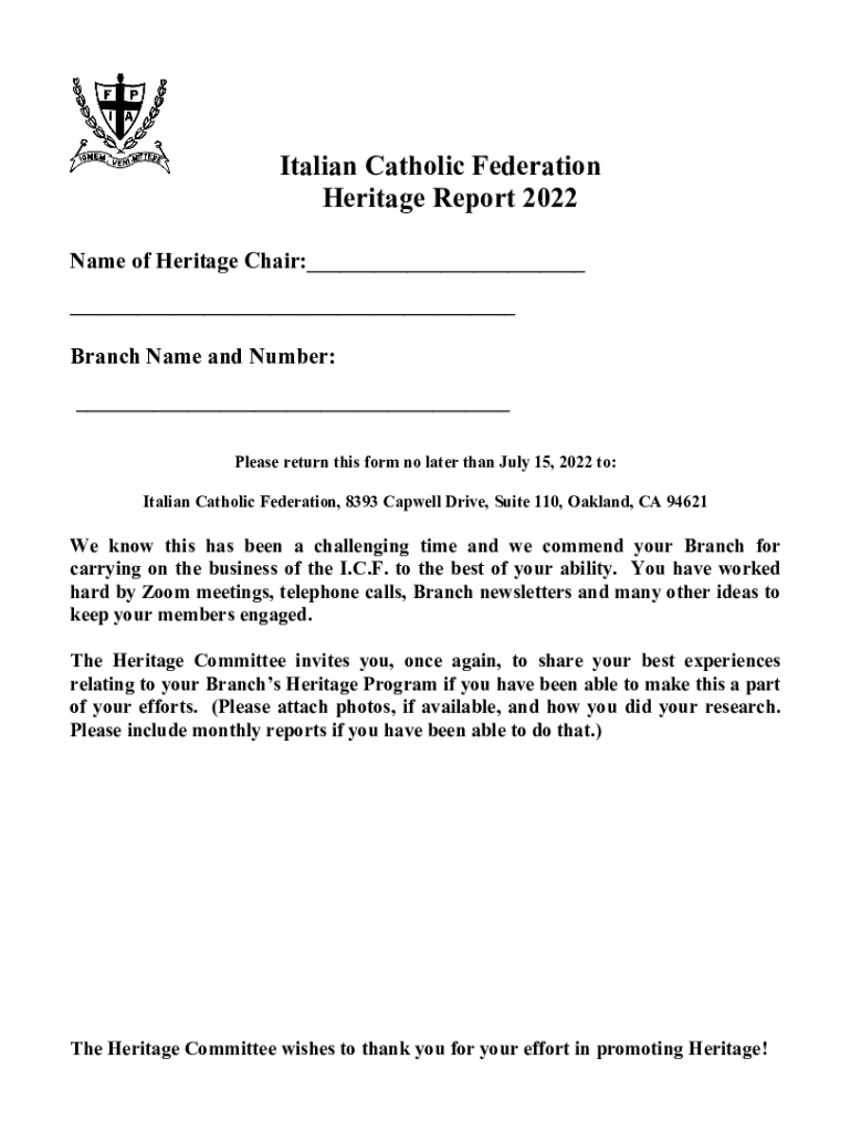 Italian Catholic Federation Heritage Report 2022 Name of Heritage Chair:___ ___ Branch Name and Number: ___ Please return this form no later than July 15, 2022, to: Italian Catholic Federation, 8393