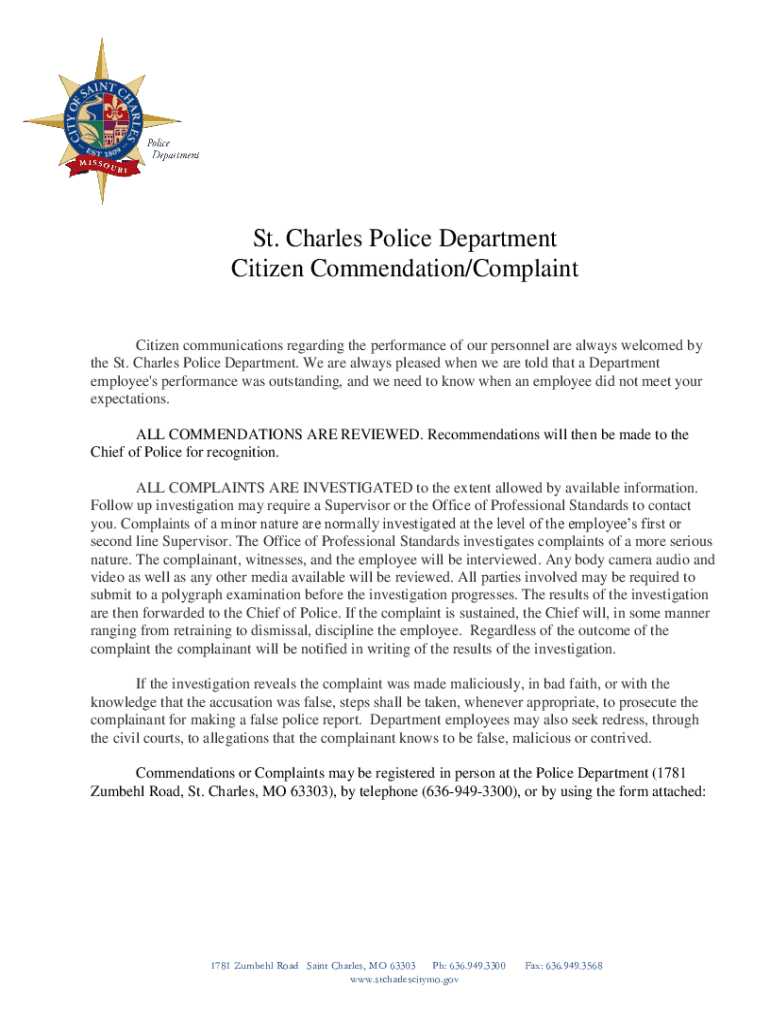 St. Charles Police Department Citizen Commendation/Complaint Citizen communications regarding the performance of our personnel are always welcomed by the St. Charles Police Department. We are always