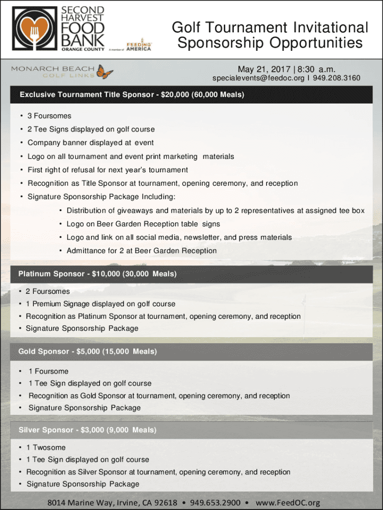 Golf Tournament Invitational Sponsorship Opportunities May 21, 2017 | 8:30 a.m. specialevents@feedoc.org I 949.208.3160 Exclusive Tournament Title Sponsor $20,000 (60,000 Meals) 3 Foursomes 2 Tee